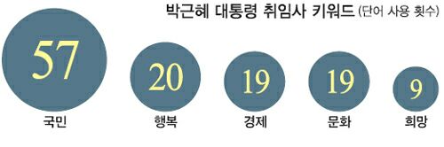 박 대통령의 취임사 키워드는 국민, 행복, 경제로 요약할 수 있다. 원고지 26장 분량의 취임사에서 가장 많이 언급된 단어는 국민으로 모두 57회나 등장했다. 이어 행복 20회, 경제·문화 19회, 희망 9회 순이었다. 박 대통령이 대통령직인수위 활동을 종료하며 국정비전으로 내세웠던 ‘국민행복, 희망의 새 시대’를 다시 강조하고 경제성장의 의지를 재확인한 것으로 보인다. 5년 전 이명박 전 대통령이 선진(15회), 기업(14회)을 핵심 주제어로 사용한 것과는 차별화한 모습이다.