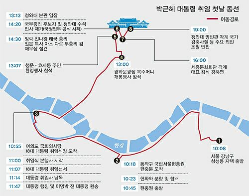 박 대통령은 현충원 참배 후 현대차 에쿠스 리무진 방탄차로 갈아타고 오전 10시55분 국회의사당 취임식장에 등장했다. 이내 연단 위로 당당히 걸어 올라가 손을 흔들며 제18대 대통령의 공식 취임을 알렸다. 취임식 후 국회의사당 앞에서 국회대로 카퍼레이드를 벌인 뒤 곧장 광화문광장으로 이동해 ‘희망의 복주머니 개봉 행사’에 참석했다.