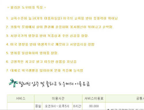 | 필리핀 입주 도우미의 특징과 급여에 대해 설명해 놓은 한 직업소개소의 인터넷 홈페이지 캡처 화면. 민간 직업소개소가 외국인의 직업을 알선하거나 고용허가제 대상이 아닌 필리핀 도우미를 고용하는 것은 불법이지만 많은 소개소가 버젓이 영업을 하고 있다. |