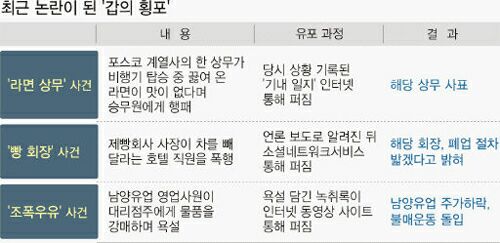 최근 ‘갑의 횡포’가 잇따라 세상에 고발되는 과정에는 인터넷과 SNS가 결정적인 역할을 했다. 포스코 계열사의 한 상무가 항공기 내에서 “라면이 맛이 없다”며 승무원에게 행패를 부린 ‘라면 상무’ 사건은 당시 상황을 기록한 항공사의 내부 문서가 인터넷을 통해 퍼지면서 파장이 걷잡을 수 없이 커졌다. 일부 네티즌은 해당 상무의 신상을 낱낱이 공개했고, 결국 기업 측의 공식사과와 상무의 사표라는 결과를 이끌어 냈다.