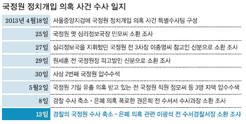 검찰은 그동안 네이버 등 포털을 포함 10여곳에서 국정원 직원으로 의심되는 아이디의 댓글 등을 찾아낸 데 이어 이를 토대로 15곳까지 수사를 확대해 혐의를 입증할 단서를 어느 정도 확보한 것으로 알려졌다. 경찰 조사에 불응했던 민모 전 국장과 이종명 전 3차장, 원 전 원장 등도 불러 조사했다. 13시간에 걸쳐 국정원을 압수수색하는 등 적어도 수사형식에서만큼은 ‘뒷말’이 나오지 않게 했다. 권은희 전 수서경찰서 수사과장의 폭로로 촉발된 경찰 수뇌부의 수사 축소·은폐 의혹도 해소하기 위해 수사 중이다.