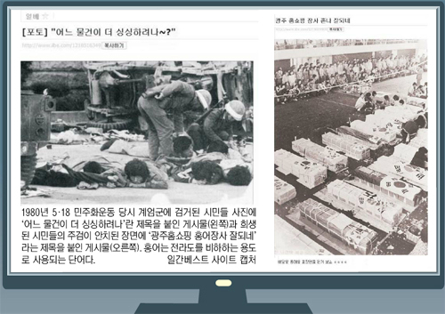 ‘광주홈쇼핑 홍어장사 잘되네’라는 제목의 게시물은 1980년 5월27일 옛 전남도청 앞에 시민들의 주검이 안치된 관들이 놓여 있는 사진을 올리고, ‘배달될 홍어들 포장완료된 것 보소’라고 썼다. 경찰 관계자는 “희생자 유족이 사자의 명예훼손 혐의로 고소할 수 있다”고 말했다. 군이 길바닥에서 시민들을 제압한 채 검색 중인 사진을 두고서는 ‘어느 물건이 더 싱싱하려나’란 제목을 달기도 했다. 이 역시 사진 속 시민이나 희생자의 유족이 고소할 수 있다.