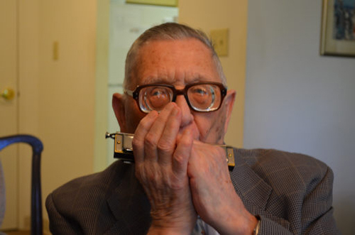 에드워드 로니 장군이 26일(현지시간) 워싱턴 서북쪽 외곽의 ‘놀우드’ 군은퇴자커뮤니티에서 가진 세계일보와 단독 인터뷰 도중 하모니카로 아리랑을 연주하고 있다. 로니 장군은 더글러스 맥아더 미 극동군사령관 참모진 중 유일한 생존 인물이다.