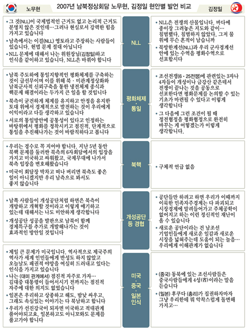 노무현 전 대통령은 2007년 남북정상회담 당시 북한 김정일 국방위원장과 만나 공식 정상회담을 한 차례 연기하면서까지 서해상 북방한계선(NLL)에서 한반도 평화체제 구축에 이르는 광범위한 현안을 놓고 의견을 교환했다. 이 과정에서 노 전 대통령은 NLL을 무효화하려는 김 전 위원장의 ‘평화수역화’ 방안에 동조하는 언급을 한 것으로 확인됐다. 노 전 대통령은 김 전 위원장을 만나 북한 체제를 인정하는 바탕 위에서 남북한이 손잡고 북핵 문제를 해결한 뒤 정전체제를 평화체제로 전환시켜 점진적 통일을 이루겠다는 구상을 설파했으나 김 위원장은 북핵 같은 곤란한 현안에 대해선 구체적 언급을 하지 않은 채 NLL 무력화(無力化) 등을 시도했다.