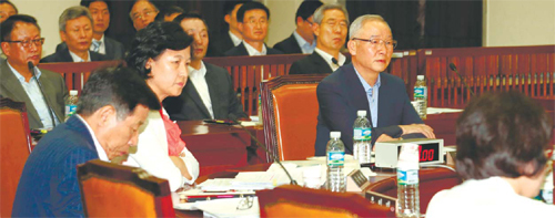 남재준 국가정보원장(오른쪽)이 25일 오전 국회 정보위 전체회의에 출석해 2007년 남북정상회담 회의록 전문 공개의 적법성 여부를 따지는 의원들의 질의를 듣고 있다.
