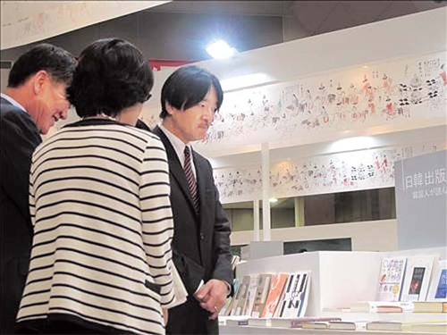 아키히토(明仁) 일본 왕의 차남인 아키시노노미야(秋篠宮·46·오른쪽) 왕자가 3일 개막한 도쿄국제도서전 한국관을 방문해 한·일 문화교류를 재조명한 특별전시장을 둘러보고 있다. 대한출판문화협회는 왕자 부부에게 이들의 이름을 한국어로 표기한 명함과 훈민정음 해례본, 신라 왕관 사진집을 선물했다. 대한출판문화협회 제공 |