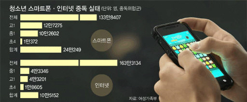 여성가족부가 5∼6월 청소년 133만8407명(초4·중1·고1)을 대상으로 ‘2013 인터넷·스마트폰 이용습관 전수진단’을 한 결과, 전체 학생의 18%인 24만여명이 스마트폰 중독 위험군에 속한 것으로 나타났다.