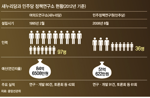 민주당 민주정책연구원(민정연)도 사정은 비슷하다. 총지출액의 60%가량인 30억4433만원을 36명(박사급 5명, 석사급 6명 등 연구원 17명과 일반직원 19명) 인건비로 사용했다. 1인당 1억원 가까운 연봉을 받은 것이다. 연구원 소속 직원이 누락된 것 아니냐는 의혹도 제기된다. 당 관계자는 “연구원 소속으로 중앙당에서 근무하는 직원들이 있는데 빠진 것 같다”고 말했다. 적어도 20, 30여명이 누락된 것으로 알려졌다.