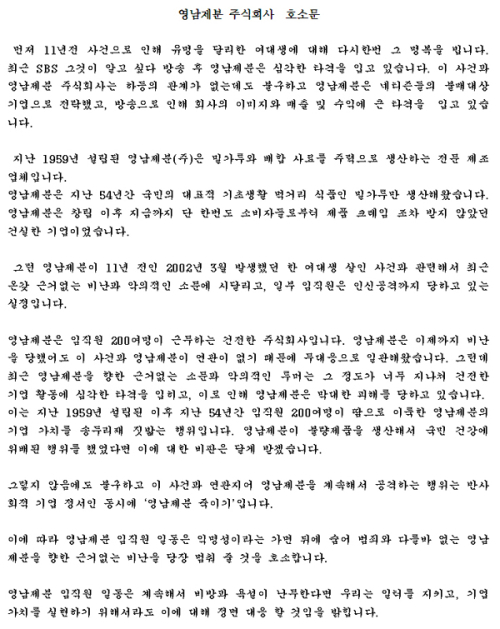 영남제분은 지난 1일 자사 홈페이지에 ‘영남제분 주식회사 호소문’이라는 제목의 공지를 띄웠다. 영남제분은 이 호소문에서 “11년 전 사건으로 유명을 달리한 여대생에 대해 명복을 빈다”며 “방송 후 영남제분은 심각한 타격을 입고 있다”고 밝혔다. 이어 “이 사건과 영남제분은 하등의 관계가 없는데도 네티즌들의 불매대상으로 전락했다”며 “회사 이미지와 매출 및 수익에 큰 타격을 입고 있다”고 덧붙였다.