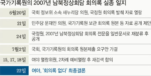 지난해 대선과 검찰 수사를 통해 한번 걸러졌던 NLL 논란은 지난 6월17일 민주당 박영선 의원이 “NLL 포기 논란은 국정원과 새누리당이 짠 시나리오”라고 주장하고 새누리당 정문헌 의원이 “명백한 허위사실”이라고 반격하면서 되살아났다. 국정원이 6월24일 회의록 전문을 전격 공개하는 바람에 여야는 지난 2일 국회 본회의에서 정상회담 관련 자료 제출 요구안을 의결했고 결국 이날 회의록이 없다는 사실을 확인하게 됐다.