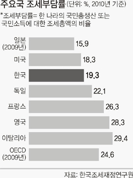 한국의 조세부담률은 2010년 기준 19.3%다. 영국(28.3%), 프랑스(26.3%), 독일(22.1%) 등 유럽 선진국은 물론 경제협력개발기구(OECD) 평균(24.6%)보다도 낮은 편이다. 이처럼 조세부담률이 높지 않은 상황에서 앞으로 ‘돈 나갈 데’는 많다는 것이 문제다.