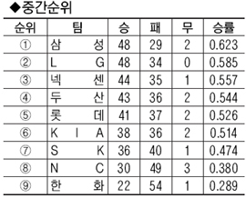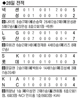 6위 KIA와 7위 SK는 나란히 9회 뒤집기를 연출하고 포스트시즌 진출 불씨를 되살렸다. KIA는 마산 원정에서 4-4로 맞선 9회초 안치홍의 쐐기 3점포에 힘입어 NC에 8-4 역전승을 거두고 3연패에서 벗어났다. SK도 부산 원정경기에서 1-3으로 뒤진 9회초 최정의 2타점 2루타 등에 힘입어 4-3 역전극을 연출했다.