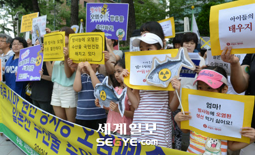 시민방사능감시센터와 여성환경연대 등 환경·시민단체들이 1일 서울 종로구 중학동 일본대사관 앞에서 후쿠시마 원전 방사능 오염 폐수 무단 방류 규탄 기자회견을 열고 있다.