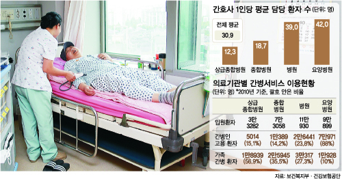 우리나라는 인구 1000명당 간호사 수가 4.6명(2010년 기준)으로 경제협력개발기구(OECD) 회원국 평균(8.6명)의 절반 수준에 불과하다. 간호사 1명이 담당하는 환자 수도 미국은 5명, 일본은 7명인데 우리나라는 평균 30명에 이른다. ‘보호자(간병인) 없는 병상’이 현실화하려면 간호인력 충원이 관건인 셈이다. 간호사와 간호조무사가 환자 수발까지 들려면 간호사 1명당 환자 7∼8명을 담당하는 것이 이상적이라고 전문가들은 말한다. 고려대 김현정 교수는 이를 전제로 할 경우 간호 인력 16만9000명이 추가로 필요하다고 추산했다.
