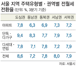 시는 올해 3분기 주택유형별·권역별 전월세 전환율을 산정한 결과 도심권(용산구 종로구 중구)의 단독·다가구가 9.4%로 가장 높았고, 동남권(강남구 강동구 서초구 송파구)의 아파트가 가장 낮은 6.3%였다고 밝혔다. 시는 향후 월세 세입자를 보호할 수 있는 제도가 주택임대차보호법에 보다 다양하게 규정될 수 있도록 관련 부처에 지속적으로 건의할 계획이다. 이건기 서울시 주택정책실장은 “지금은 실거래계약을 공개하는 수준이지만 차후 선진제도를 우리 실정에 맞는 월세계약 기준으로 활용하는 등 세입자 주거권 강화에 앞장서겠다”고 말했다.