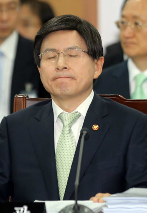 | 황교안 법무부 장관이 17일 과천 법무부 청사에서 열린 국회 법제사법위원회 국정감사에서 의원들의 질의가 시작되기 전 잠시 눈을 감고 생각에 잠겨 있다. 연합뉴스 |