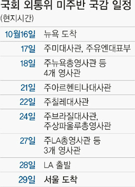 남미 일정은 주미 국감 일정에 비하면 상대적으로 여유가 있다. 19일 오전 부에노스아이레스에 도착해 20일 하루 쉬고 21일 주아르헨티나대사관, 22일 주칠레대사관 국감을 벌인다. 23일 브라질로 이동한 뒤 24일 주브라질대사관과 주상파울루총영사관 국감을 벌인다.