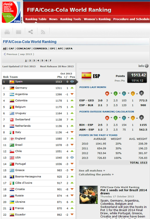 국제축구연맹(FIFA)은 지난 17일(현지시각) 세계 랭킹을 발표했다. 그 결과 1위는 스페인, 2위는 독일, 3위는 아르헨티나로 확정됐다. 이어 콜롬비아가 4위에 올랐고, 5위와 6위에는 벨기에와 우루과이가 명함을 내밀었다. 7위는 스위스이며, 개최국 브라질은 11위였다.
