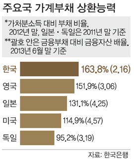 18일 국회 기획재정위의 한국은행 국정감사 자료에 따르면 한국 가계의 가처분소득 대비 부채 비율은 글로벌 금융위기 이후 상승 일변도다. 2008년 말 149.7%에서 해마다 뛰어 2011년 말 162.9%, 2012년 말 163.8%까지 치솟았다. 소득 증가보다 높은 부채 증가 속도를 감안하면 연말 이 수치는 더욱 높아질 것으로 예상된다. 선진국들은 가계의 소득 대비 부채 비율이 현저히 낮다. 2012년 말 기준 미국 114.9%, 영국 151.9%이고 2011년 말 기준 독일 95.2%, 일본 131.1%이다. 상환능력을 가늠하게 하는 또 다른 지표인 가계의 금융부채 대비 금융자산 배율은 지난 6월 말 2.16이다.