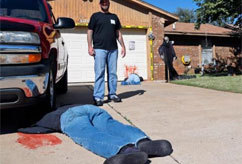 한 남성이 집·차고 진입로에 차고 문에 부딪혀 숨진 듯 엎어져 있다. 이 남성의 혈액이 차고 문에 묻어 있다. 얼마 안 떨어진 곳에 한 남성이 트럭에 깔렸다.