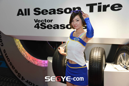 일본 도쿄에서 열린 제43회 도쿄모터쇼의 타이어 부스에서 모델이 포즈를 취하고 있다. 도쿄모터쇼는 20일 언론공개를 시작으로 12월1일까지 계속된다. 177개 브랜드가 자동차와 모터사이클, 타이어 등을 출품하며 총 76개 제품이 세계 최초로 공개된다.