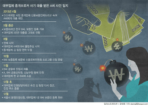 과도한 추심을 견디다 못한 A씨는 연체 3개월 뒤 신용회복위원회를 찾았다. 법률상담소도 7곳이나 찾아갔다. 금융감독원 불법사금융피해신고센터에도 수차례 전화를 걸었다. 모두 “중개업체 잘못이지 대부업체는 잘못이 없다”며 방관했다. 경찰은 냉담했다. 사기로 고소하러 강남경찰서를 찾은 B씨에게 경찰은 “수수료를 떼먹고 도망친 것이 아니라 고소가 안 된다”고 설명했다. 불법추심이라도 막기 위해 강남구청에 민원도 제기했지만 구청 측은 되레 “(추심은) 업체 마음이죠”라며 대부업체 편을 들었다. 백방으로 수소문한 끝에 A씨는 지난해 11월 한 시민단체 관계자의 도움을 받아 서울시에 분쟁조정을 신청해 ◇◇◇캐시로부터 B씨의 보증인등록 취소를 통보받았다. 한 가닥 희망이 보였다. 그러나 나머지 두 곳은 B씨에게 여전히 추심을 진행 중이다.