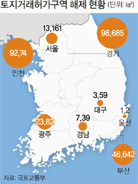 시·도별로는 경기도(98.685㎢), 인천시(92.74㎢), 부산시(46.642㎢)의 해제 폭이 컸다. 특히 대구시(3.59㎢), 광주광역시(23.82㎢), 울산시(1.2㎢), 경상남도(7.39㎢)는 이번 조치로 국토부 지정 토지거래허가구역이 전부 해제됐다.