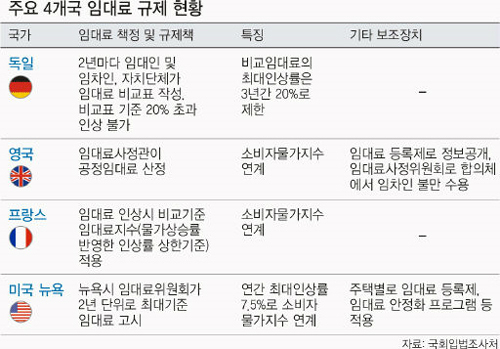 한편 우리나라는 계약 기간 중 보증금이나 월세를 올릴 때만 연 5% 이내로 규제하지만 새로 전월세 계약을 맺거나 갱신할 경우엔 제한이 없다. 입법조사처는 ‘5% 규제’ 조항에 대해 “이를 규제하기 위해 소요되는 행정비용 등이 막대하기 때문에 현실적으로 실효성이 없다는 지적을 받고 있다”고 설명했다.