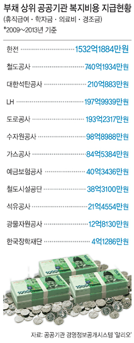 9일 기획재정부와 공공기관 경영정보공개시스템인 ‘알리오’(www.alio.go.kr)에 따르면 부채 상위 12개 공기업이 2009년부터 2015년까지 5년간 직원에게 지급한 보육비, 학자금, 경조금, 휴직급여, 의료비 등 복지비용은 3174억원이었다.
