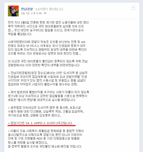 그러나 경찰은 글 하단에 '2014. 2. 10부터 2. 21까지 2주간'이라고 점검 기간을 명시해 보는 이를 황당하게 했다. 불시 단속이 단연 효과적일텐데 예고로 단속을 피해갈 수 있는 여지를 남긴 경찰이 이해 안된다는 반응이 대부분이다.