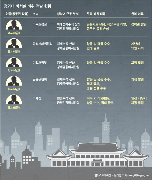 대통령 비서실은 대한민국 최고 권력자인 대통령의 국정운영을 곁에서 보좌하는 참모진이다. 최고 수준의 업무 역량과 함께 누구보다도 높은 수준의 도덕성, 청렴성이 요구된다. 하지만 청와대 내부 감찰에 적발된 3∼5급 행정관 5명의 행태를 보면 공직엘리트의 소명의식과는 거리가 멀었다. 청와대는 이들을 조용히 소속부처로 돌려보내며 징계를 마무리했다. 해당부처는 아무런 조치 없이 새로운 보직을 맡겼다. 관료사회 전반에 깊게 뿌리 박힌 ‘비위 불감증’을 단적으로 보여준다는 비난을 면키 어렵다.