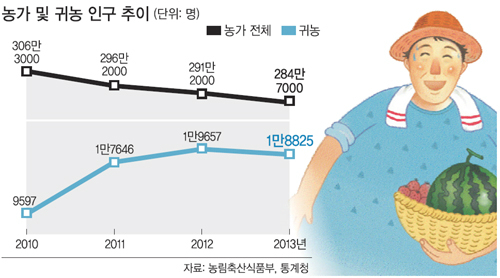 정부가 최근 귀농귀촌 통계를 발표하면서 농촌에서 도시로 떠나는 흐름이 반대로 바뀌었다며 자화자찬한 내용이다. 하지만 실제 농업활동을 하는 귀농 인구의 증가세는 꺾인 것으로 나타났다. 또 전체 농가인구는 지속적으로 줄어들고 있다. 정부의 이 같은 섣부른 인식은 자칫 잘못된 농업 정책으로 이어질 수 있다. 특히 정부는 귀농 인구의 소득이나 역귀농 실태 등에 대해선 제대로 파악조차 하지 못하고 있다. 도시에서 농촌으로 사람들이 많이 오고 있다는 점만 부각해 ‘귀농에 대한 장밋빛 환상’만 부채질한다는 지적도 있다.