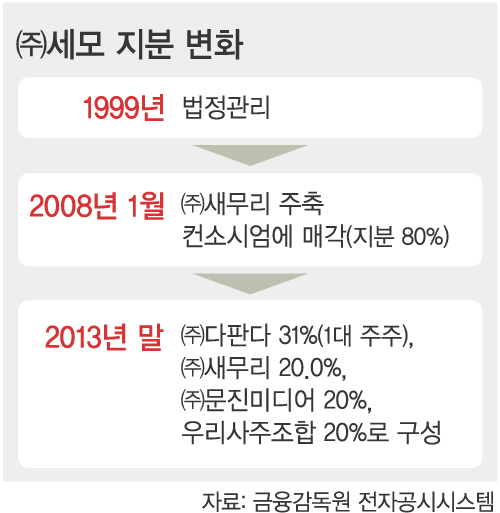 27일 금융감독원 전자공시시스템에 따르면 ㈜새무리는 2008년 1월 ㈜다판다, 문진미디어 등과 컨소시엄을 구성해 당시 법정관리 중이던 세모의 지분 80%를 인수했다. ㈜다판다는 대균씨가 최대 주주이고, 문진미디어는 혁기씨가 대표이사로 있다. 앞서 1999년부터 법정관리를 받던 세모는 이 컨소시엄의 투자금으로 담보·채권문제를 대부분 해결해 2008년 2월 말 법정관리에서 벗어났다.