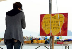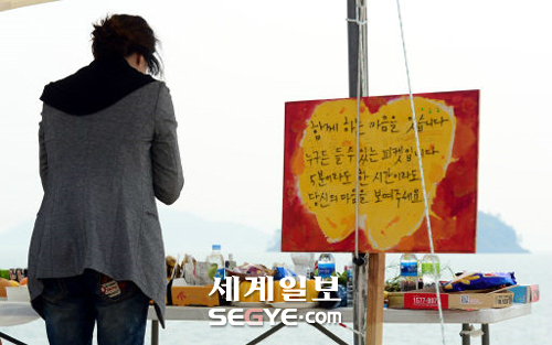 세월호 침몰사고 17일째인 2일 전남 진도 팽목항에서 한 실종자 가족이 ‘함께하는 애도의 마음’을 담은 노란 팻말 앞에서 바다를 바라보며 희망의 끈을 이어가는 기도를 하고 있다.