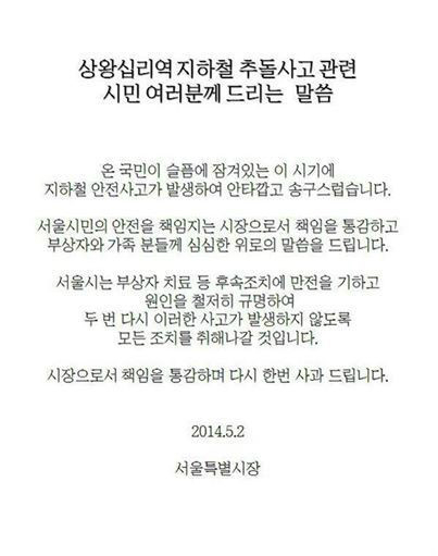 박원순 시장은 "부상자에 대한 치료와 빠른 복구를 통한 지하철 정상화, 사고 원인규명을 통한 재발방지 조치가 위기에 영웅적 행동을 해주신 시민들에 대한 보답의 길이란 생각해 현장을 떠나지 못하고 상황실을 지켰다"며 다시 한번 사과를 전했다.
