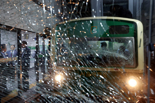 | 2일 오후 서울메트로 2호선 상왕십리역에서 잠실 방향으로 가는 열차가 추돌하는 사고가 발생, 사고 열차의 유리창이 깨져있다. <연합> |
