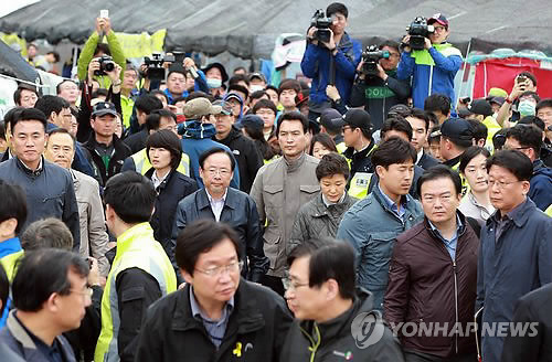 면담을 마치고 박 대통령은 천막에서 나와 이주영 해양수산부 장관과 함께 임시 시신 안치소가 마련된 부두로 발걸음을 옮겼다.