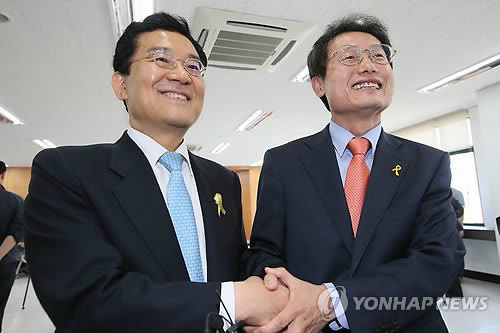 지난 15일 오전 고승덕·조희연 후보가 서울시 선관위에서 서울시 교육감 선거 후보등록 서류를 제출한 뒤 선전을 다짐하고 있다. |