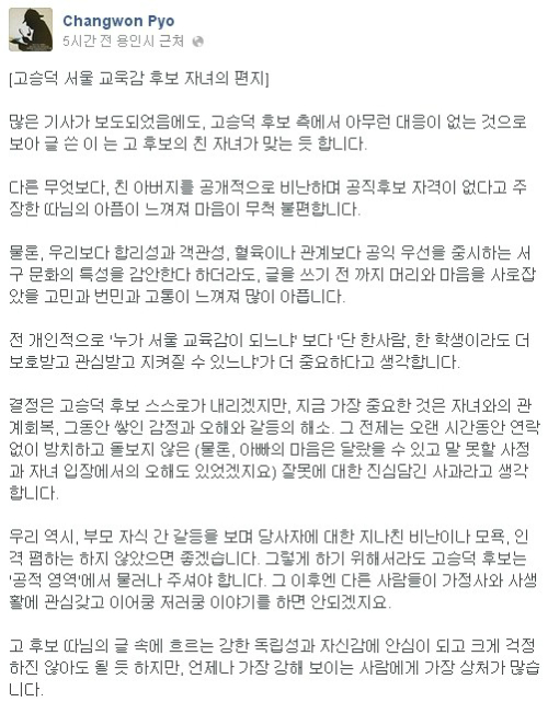 표창원 전 경찰대학 교수가 고승덕 서울시 교육감 후보 친딸이 올린 글에 대해 공감하는 모습을 보였다.