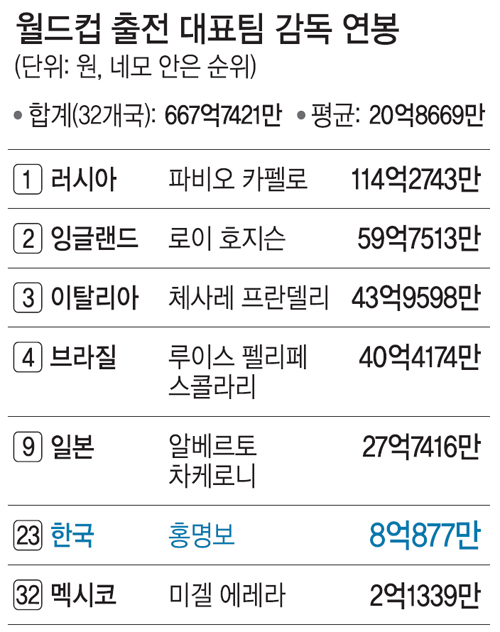 멕시코 에레라 2억으로 가장 적어 2014 브라질 월드컵에 참가하는 각국의 사령탑 중 러시아의 파비오 카펠로 감독이 가장 많은 연봉을 받는 것으로 나타났다.