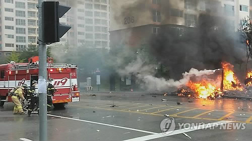 17일 오전 10시53분께 세월호 수색 지원 업무를 마치고 복귀하던 강원소방본부 헬기가 광주 광산구 장덕동에 추락해 소방대원들이 화재를 진압하고 있다. |
