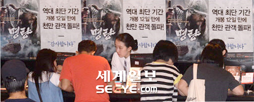 | 개봉 12일 만에 1000만 관객을 돌파한 영화 ‘명량’을 보기 위해 영화관을 찾은 관객들이 10일 서울 용산의 CGV에서 표를 사고 있다. 이제원 기자 |
