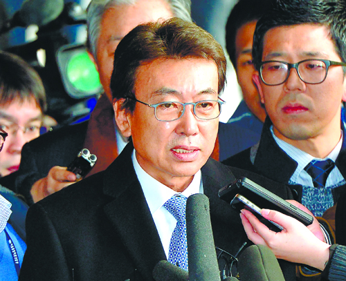 모습 드러낸 정윤회 비선실세 국정개입 의혹 사건의 당사자인 정윤회씨가 10일 오전 서울 서초구 서울중앙지검으로 들어서며 취재진의 질문에 답하고 있다. 이재문 기자 |