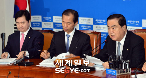 | 새정치민주연합 문희상 비상대책위원장(오른쪽)이 14일 국회에서 열린 비상대책위원회의에서 정부의 노동개혁 등에 대해 발언하고 있다. 새정치연합은 이날 ‘문건파동 배후설’ 논란과 관련해 특검 도입을 촉구했다. 오른쪽부터 문 위원장, 최문순 강원도지사, 이석현 국회부의장. 이재문 기자 |