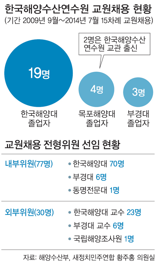23일 새정치민주연합 황주홍 의원이 해양수산부에서 제출받은 자료에 따르면 한국해양수산연수원은 2009년부터 2014년까지 15차례에 걸쳐 교원을 채용하면서 시범강의 외부 전형위원 추천 의뢰기관을 한국해양대에 집중했다. 6년간 한국해양대에 15차례, 부경대에 3차례, 국립해양조사원에 1차례 의뢰했다.
