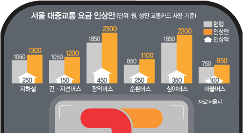 서울의 대중교통요금이 오르면 2012년 2월 지하철과 버스요금이 150원씩 인상된 이후 3년4개월 만이다. 서울시 관계자는 “지하철 운송원가가 1인당 1185원으로 1인당 928원인 버스보다 257원 높다”면서 “원가 차이를 고려하고 지하철 노후시설 개선 투자를 앞당기고자 지하철과 버스 요금에 차이를 두기로 했다”고 설명했다.