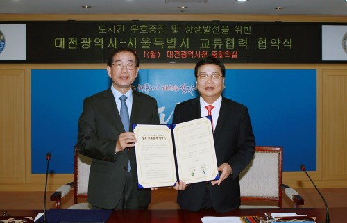권선택 대전시장과 박원순 서울시장은 1일 대전시청에서 양 도시의 우호증진과 상생발전을 위한 ‘대전·서울 교류협력 협약’을 체결했다. 협약에서 두 도시는 상호 교류를 활성화하기 위해 도시행정 혁신정책 및 시정발전 성공사례 정보를 공유하고, 공공 및 민간단체 문화예술분야 교류·협력 지원, 우수 중소기업 제품에 대한 공동판매 및 협력체계 구축, 비영리 민간단체 간 네트워크 및 교류활동 지원, 지역발전 방안 공동연구 및 공무원 인사교류 추진 등 5개 과제를 추진키로 합의했다.