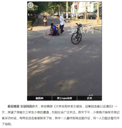 이름이 알려지지 않은 여대생은 할머니를 부축해 병원으로 옮겼으나 가족들의 배상 요구에 눈물을 흘려야 했다. 그가 자전거로 할머니를 치어 다치게 했으니, 모두 책임져야 한다고 가족들이 주장한 것이다.