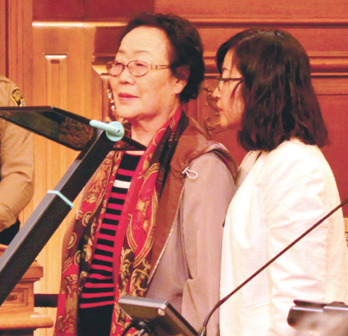 | 일본군 위안부 피해자인 이용수 할머니(왼쪽)가 지난 15일 미국 캘리포니아주 샌프란시스코 시의회 대회의장에서 위안부 소녀상 건립 결의안을 통과시킬 것을 촉구하고 있다. |