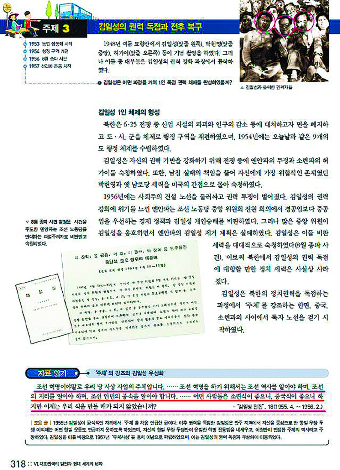 | 김일성 1인 체제에 대해 소단원에 걸쳐 다룬 한 고등학교 한국사 교과서. 북한에서 우상화를 목적으로 발행된 ‘김일성 전집’의 내용까지 발췌해 실었으나 주체사상이 독재나 우상화에 이용됐다는 비판적인 부분은 아래 작은 글씨로 처리했다. |